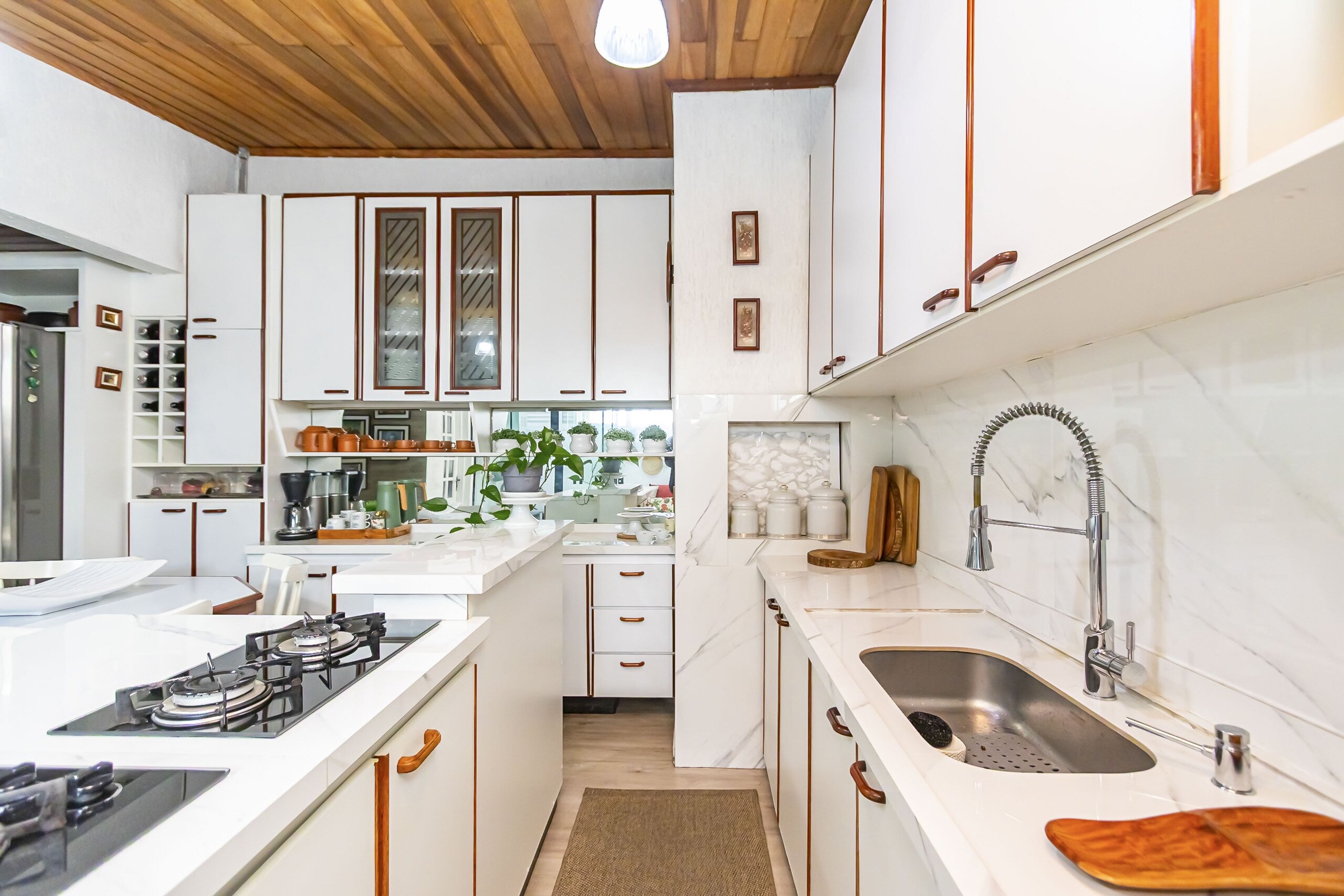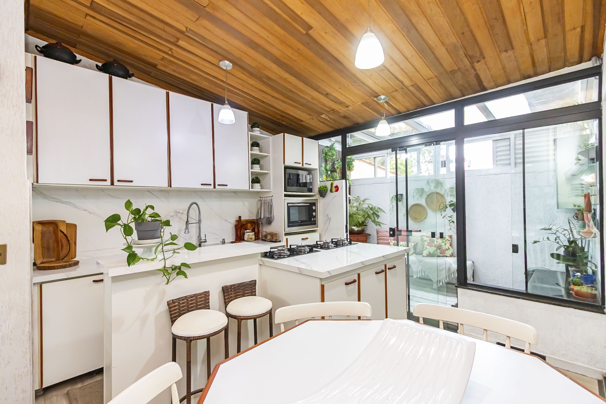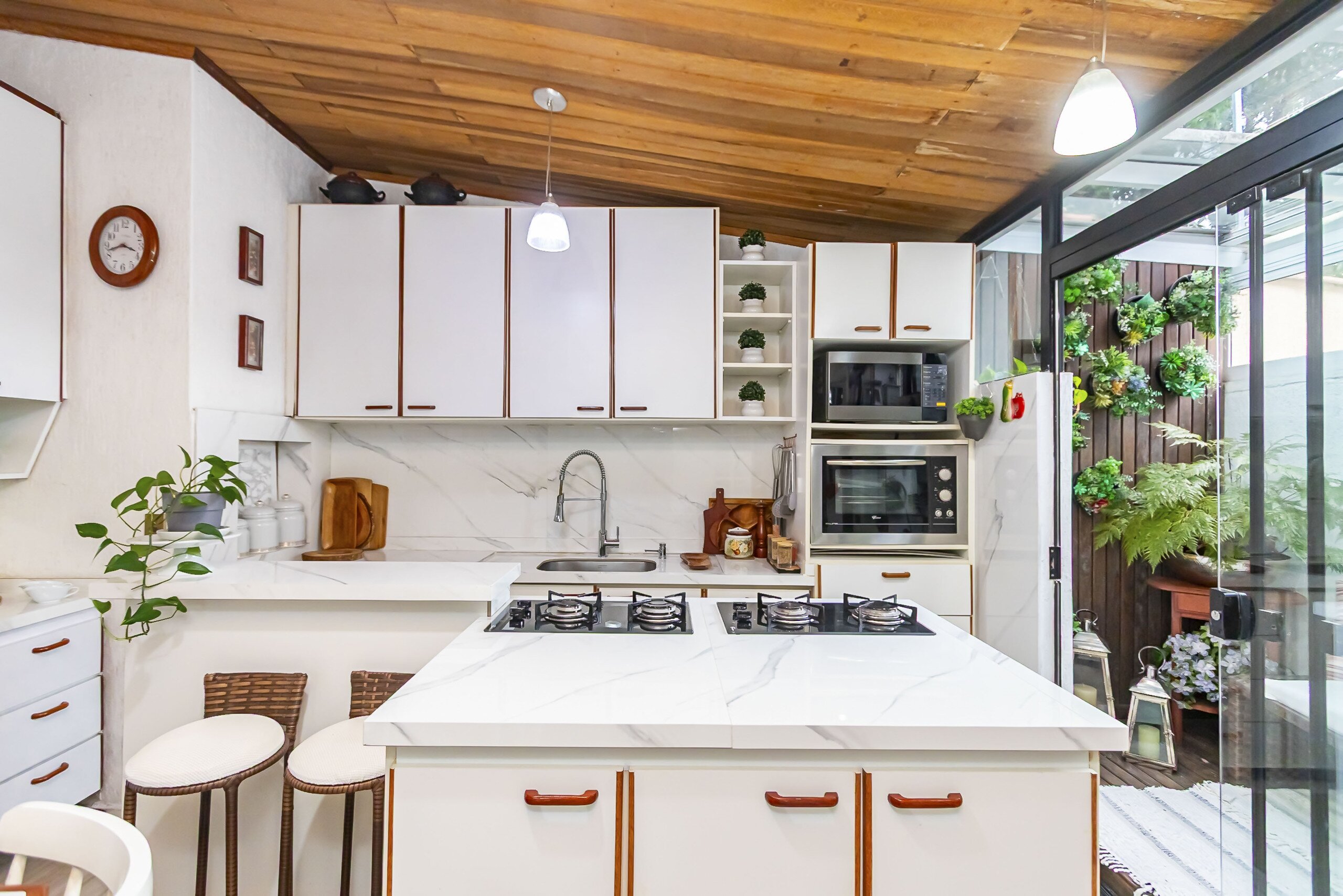 Cozinha gourmet com churrasqueira a carvão, armários planejados, bancadas em granito e fogão